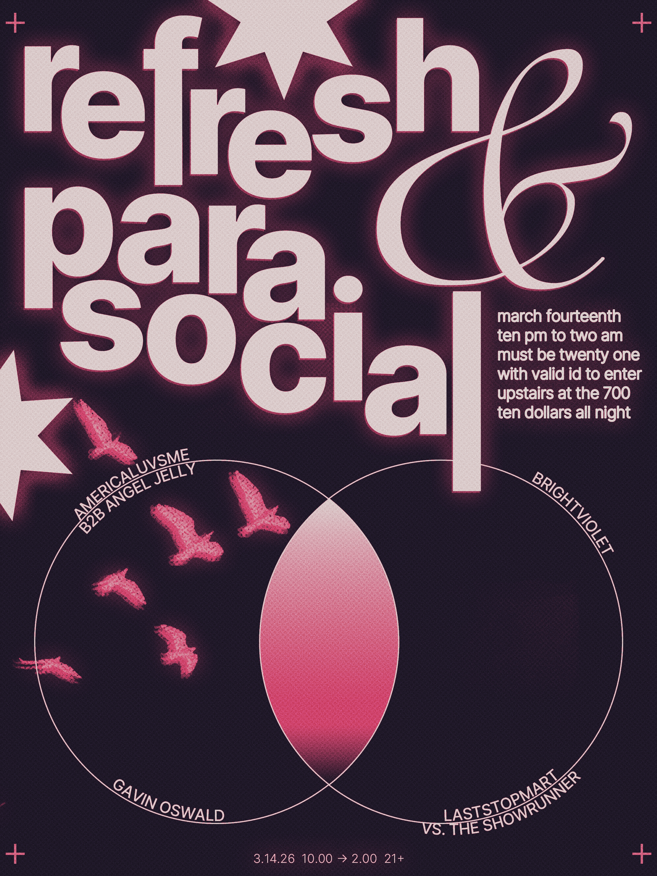refresh coming up on march 13th as a collab between us and fellow philadelphia collective parasocial! me+margaux+jonny+gavin+aso are all spinning plus we're bringing brightviolet out from nyc :3